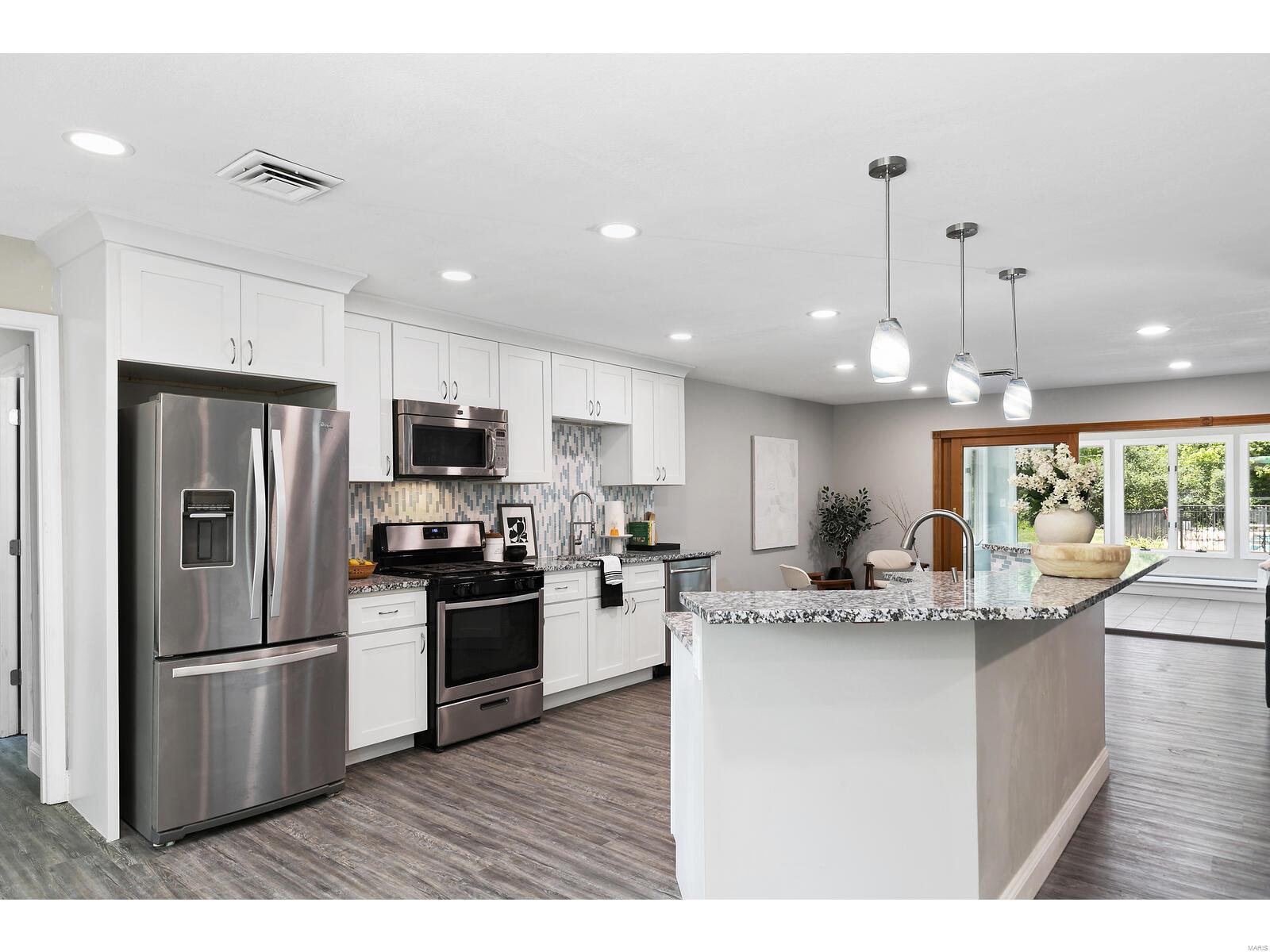 BACK ON MARKET No fault of sellers . Welcome home to this completely updated 4-bedroom, 2.5-bathroom home is a rare find. Nestled on a spacious 1.28-acre level lot with as well as park-like views, & complete with an in-ground pebble tec heated saltwater pool and sunroom overlooking the patio and pool. Step inside to an open floor plan featuring a living area adorned with not one but two beautiful stone fireplaces located in living room & bonus flex room/sitting room. The centerpiece of the home is the fully renovated kitchen boasting a large island with granite countertops, dual sinks, ceramic backsplash, and stainless-steel appliances. Roof, Water heater new. Enjoy the view of your spacious living area from your new kitchen. At one end of the home, you will find a bedroom/office with half bath. Master bedroom spacious with beautiful ensuite with updated shower/bathroom. The property also features an oversized rear insulated garage equipped with a Tesla charger. Some Accessible Features Additional Rooms: Mud Room, Sun Room